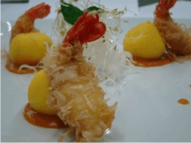 Crispy prawns over small yellow potatoes "causas" in a coral sauce with pisco.